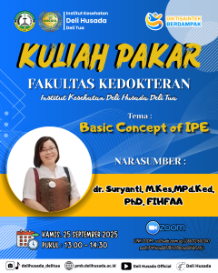 Fakultas Kedokteran Universitas Deli Husada kembali menyelenggarakan Kuliah Pakar yang menjadi salah satu kegiatan akademik unggulan dalam memperkaya wawasan dan pengetahuan mahasiswa. Kali ini, kuliah pakar menghadirkan narasumber inspiratif, dr. Suryanti, M.Kes., MPd.Ked., Ph.D., FIHFAA, yang membawakan materi bertema “Basic Concept of Interprofessional Education (IPE)”.